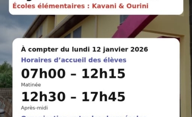 Information aux familles – Rentrée scolaire (à compter du lundi 12 janvier 2026) Afin d’assurer la continuité du service public de l’éducation dans les meilleures conditions d’accueil, la Commune de Chiconi met en place une organisation horaire adaptée pour l’école élémentaire de Kavani et l’école élémentaire d’Ourini.